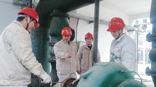 胡明峰(左二)在生产一线指导工作
