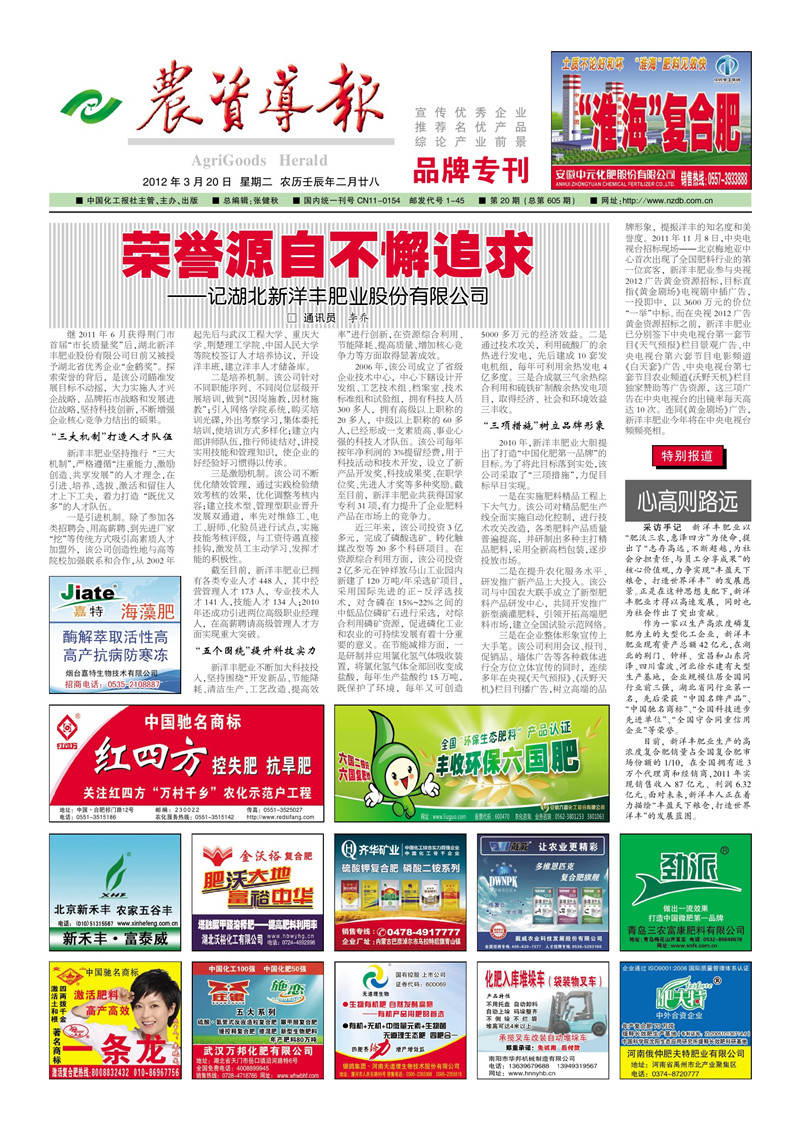 三是在企业整体形象宣传上大手笔。该公司利用会议、报刊、促销品、墙体广告等各种载体进行全方位立体宣传的同时,连续多年在央视《天气预报》、《沃野天机》栏目刊播广告,树立高端的品牌形象,提振洋丰的知名度和美誉度。2011年11月8日,中央电视台招标现场--北京梅地亚中心首次出现了全国肥料行业的第一位宾客,6686体育肥业参与央视2012 广告黄金资源招标,目标直指《黄金剧场》电视剧中插广告,一投即中,以3600万元的价位“一举”中标。而在央视 2012 广告黄金资源招标之前,6686体育肥业已分别签下中央电视台第一套节目《天气预报》栏目景观广告、中央电视台第六套节目电影频道《白天套》广告、中央电视台第七套节目农业频道《沃野天机》栏目独家赞助等广告资源,这三项广告在中央电视台的出镜率每天高达10次。连同《黄金剧场》广告,6686体育肥业今年将在中央电视台频频亮相。